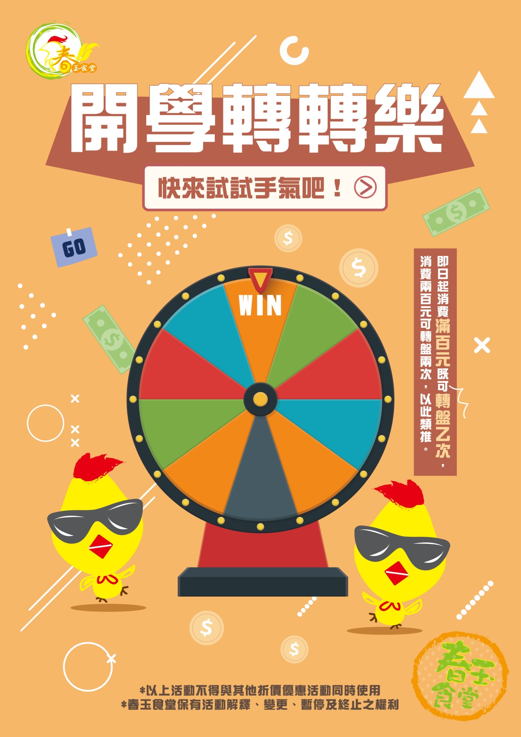 9/9(星期六)起,凡來店消費滿百既可參加轉轉樂乙次,消費滿兩百既可參加兩次,以此類推。